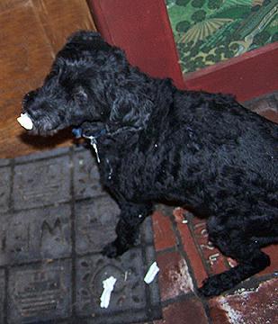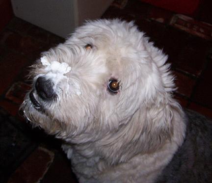 Molly got a big glob of whipped cream on her face.  She was able to lick it off everywhere except for the top of her snout!